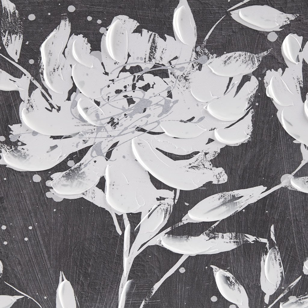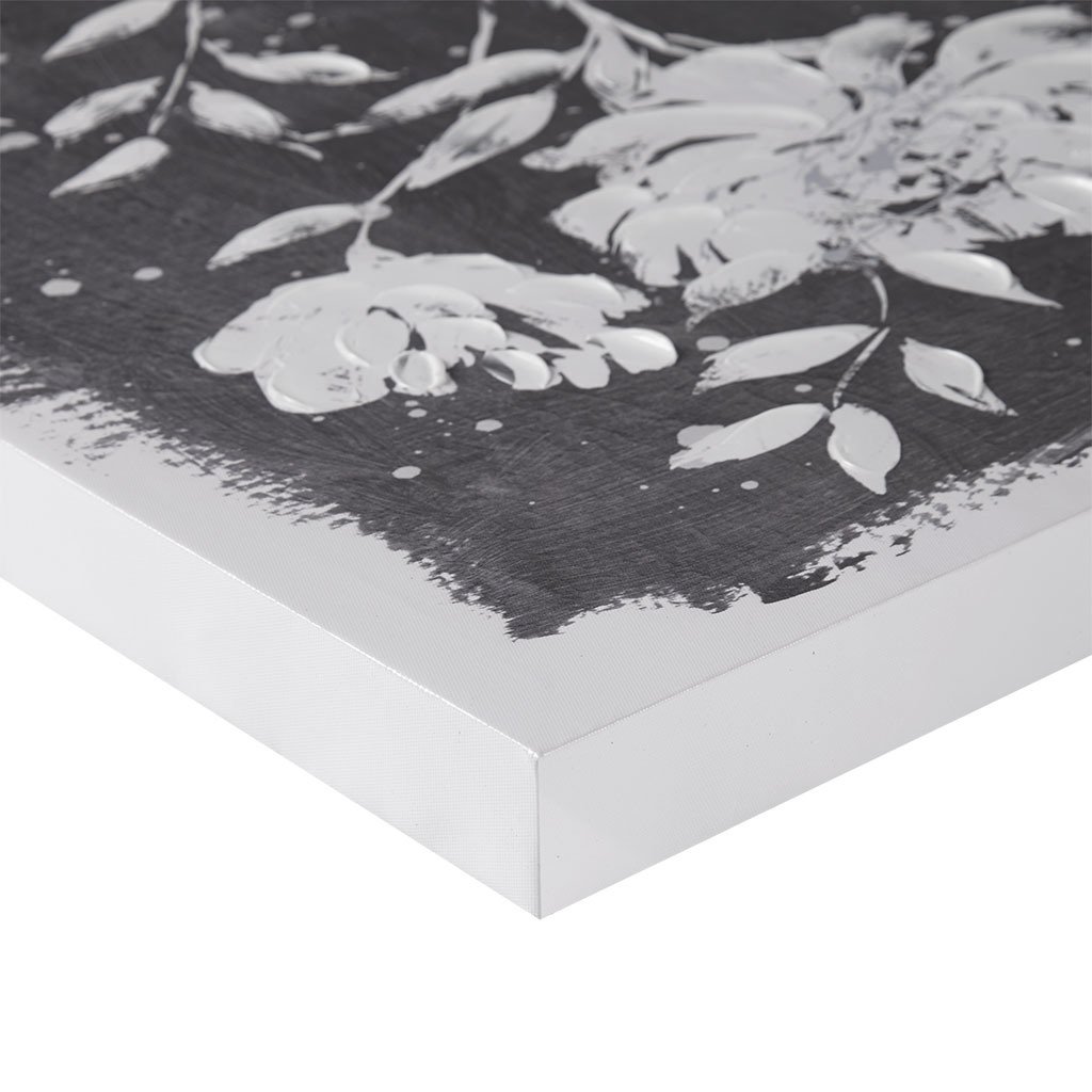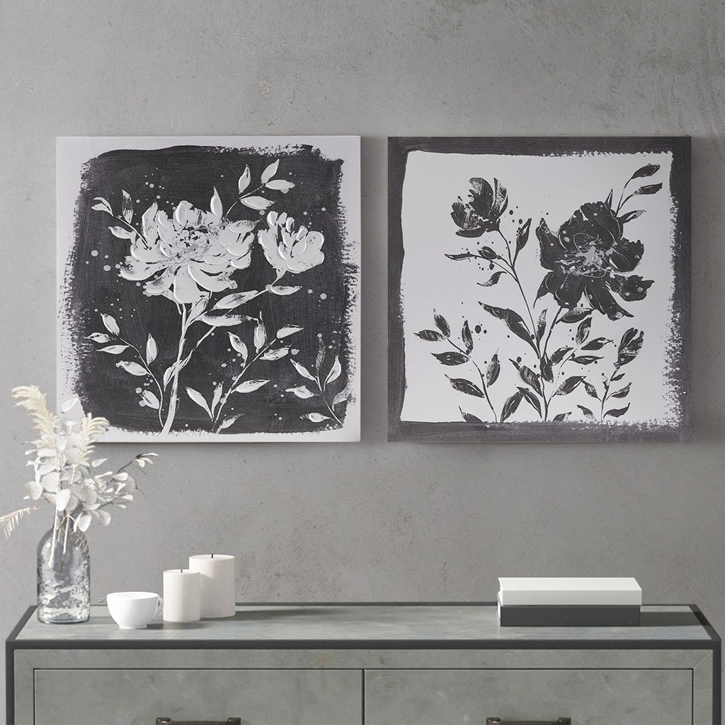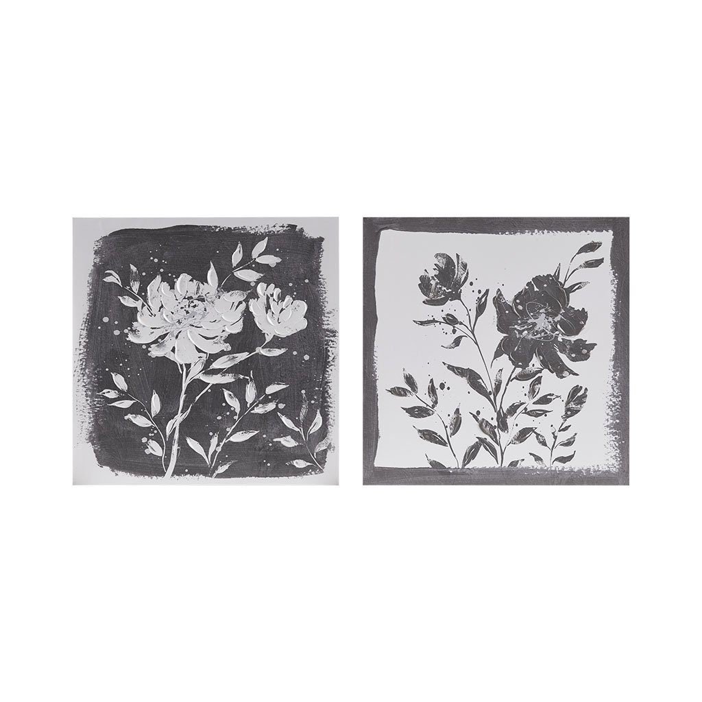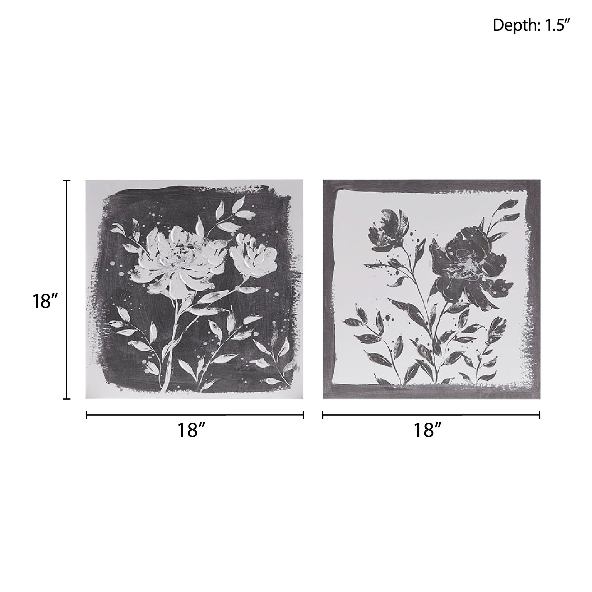 DescriptionAdd a modern update to your space with the Madison Park Cassia Embellished Floral 2-piece Canvas Wall Art Set. The wall art set features beautiful flowers in a soft black and white hue for a bold contrast touch, while the unique border retro design creates a frame like look and feel. The hand embellishments add rich texture and dimension, while a sawtooth hanger on the reverse top frame for easy hanging. Simply display both 18x18" pieces together over a console or bench for a great focus piece or hang separately to add a cohesive aesthetic throughout your living spaces.Product DetailsSee below2 Pieces:18"W x 18"H x 1.5"D (2)MaterialMDF: 90%Canvas: 10%